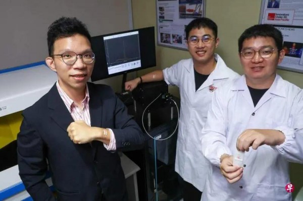 新加坡南洋理工大學研究團隊展示他們研發的創可貼型穿戴薄膜水凝膠激光器。