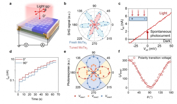 圖1. a. 器件結構示意圖;b. MoTe2調控前后的偏振二次諧波測試結果;c. 器件在暗態和光照下的輸出特性曲線;d. 器件在0偏壓下的偏振光響應;e. 器件在不同偏壓下的偏振光響應;f. 在極性轉變點對應的偏壓處,器件的偏振探測比超過300