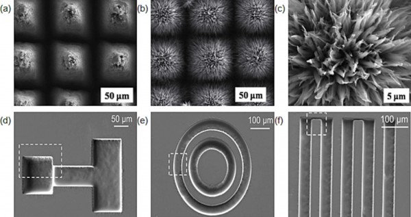 圖3.(a)飛秒激光輻照鈦表面產(chǎn)生的柱狀陣列。通過(b)化學(xué)處理和(c)退火獲得的三維結(jié)構(gòu)。通過飛秒激光微加工和退火,在PMMA表面生成了三種三維圖案:(d)由矩形凹槽連接的兩個凹槽;(e)同心圓;(f)一端部分連接的周期性矩形凹槽。
