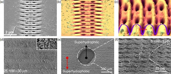 圖5.(a)飛秒激光誘導(dǎo)在鐵基金屬玻璃表面形成光柵孔結(jié)構(gòu)的SEM圖像。(b-c)飛秒激光誘導(dǎo)在鐵基金屬玻璃表面形成的光柵孔結(jié)構(gòu)的AFM圖像。(d)飛秒激光輻照PDMS制備的超疏水表面的SEM圖像。(e)通過飛秒激光去除部分PDMS并燒蝕硅表面而得到的超疏水-超親水混合表面的SEM圖像(黑色箭頭表示超親水,紅色箭頭表示超疏水)。(f)e的局部放大圖。