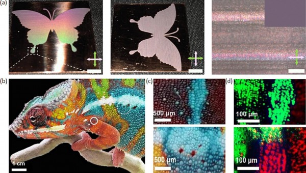 圖6.(a)從不同方位角(垂直和水平)拍攝的飛秒激光處理過的銅表面的照片和局部放大圖。 (b)變色龍的圖像。(c)變色龍皮膚的高倍放大圖像(與B中的圓圈部分相對應(yīng))。(d)仿生變色龍皮膚的全色熒光圖像。