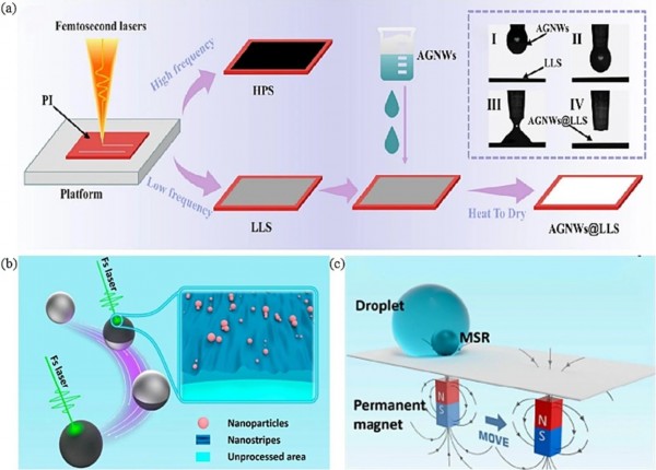 圖9.(a)飛秒激光在PI薄膜上制備的超疏水和超親水表面示意圖。(b)飛秒激光制備MSR的示意圖和MSR的理論表面形貌。(c)MSR的工作原理示意圖,其中MSR可在磁場作用下進行液滴轉(zhuǎn)移。
