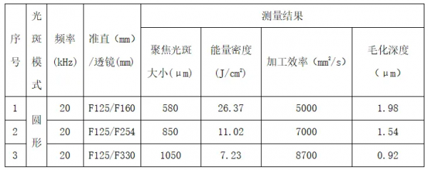 表1為不同透鏡下P1000H-P鋁殼毛化對應的能量密度和毛化深度,從表中的數據可以看出,P1000H-P毛化深度大于1.5μm時,最大光斑為850μm,加工頻率為20K,此時不考慮振鏡折返,1S內理論加工面積為0.85×0.85×20×103=14.45×103mm/s。當要求毛化深度為0.92μm,光斑為1050μm,效率可達8700mm2/s??蛻艨筛鶕髽I需求,選擇合適的參數進行相應加工。