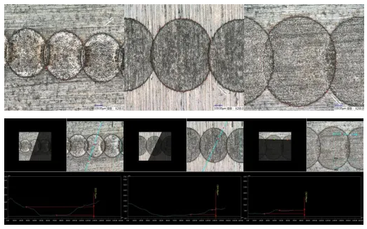 表2為P1000H-P與某進口激光器毛化效果對比,設置兩組點距和線距分別為0.4mm/0.8mm和0.4mm/0.4mm,從微觀效果圖對比可以看出兩款激光器毛化光斑分布均勻一致,熔池形態一致,經3D顯微鏡測量300倍下兩款激光器在相同點線距下Ra值和Rz值相差不大,經C公司涂覆驗證,P1000H-P批量毛化試片均達到檢測要求,由此可以得出,P1000H-P在鋁制電芯毛化應用上完全可以替代進口,為儲能企業降低生產成本。