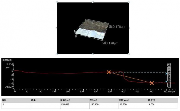 高能量單模塊1000W清洗脈沖激光器支持方型/圓形光斑定制,具有5大技術特性:(1)自研自產大模場增益光纖實現1kW平均功率,實現單模塊1000W脈沖激光輸出;(2)最大單脈沖能量提升至100mJ;(3)具有很強的抗高反能力,可垂直出光清洗高反材料;(4)最小脈寬可達20ns,用于對熱效應有要求的領域;(5)BPP小于25mm*mrad@400微米。可廣泛用于光伏領域鈣鈦礦清邊、模具清洗,船舶、飛機等大型裝備除漆,除銹;精密部件精確除漆;表面粗糙化、毛化等;尤其是在新能源動力電池藍膜、藍漆清洗等領域具有明顯優勢。而進行光伏領域鈣鈦礦清邊應用一般采用方型光斑,工藝效果更好。(2)相較直接照射鈣鈦礦膜的方案,采用透過玻璃進行激光清洗的方式效果更佳在對鈣鈦礦進行清邊處理時,首先要確定基材表面鈣鈦礦膜的厚度,為后續的清洗參數確定提供參考,確保不會由于功率過小導致清洗后有殘留,也不會使清洗激光功率過大損傷基材,測試結果如下圖2所示,膜厚度約為13μm。
