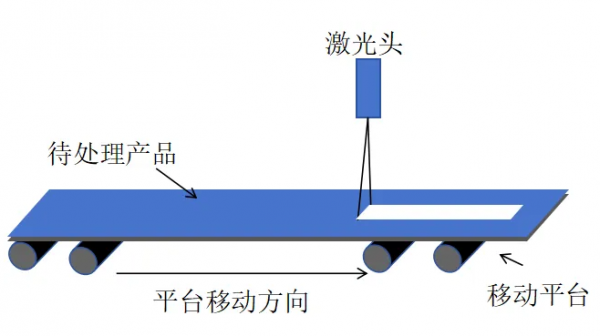 用相同的參數對鈣鈦礦正反表面進行清洗效果測試,從圖3中可見,兩種清洗方案均能保證處理完后,基材表面鈣鈦礦無殘留,且對玻璃基材沒有損傷,但采用激光直接對鈣鈦礦膜進行清洗時,產生的煙塵會對激光產生遮擋,甚至把基材玻璃熏黃。因此,相較而言采用透過玻璃對鈣鈦礦薄膜進行激光清洗的方式更為合理且效果更佳。(3)銳科旗幟P1000H方型光斑激光器鈣鈦礦清邊工藝效果良好,達成客戶要求在實際生產過程中,玻璃表面鈣鈦礦導電膜的清邊方式如下圖4所示,其中激光器保持一條線連續出光,且位置不變,下方的傳送帶帶動需要清邊的鈣鈦礦樣品快速移動,將激光器掃描速度和平臺移動速度相匹配,即可將線拓展成面,快速完成對鈣鈦礦的清邊處理。