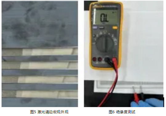 我們采用銳科旗幟P1000H方形光斑激光器,配置F170場鏡,平臺移動速度可達到115mm/s,具體清洗效果如下圖5所示,激光清洗后的玻璃表面沒有鈣鈦礦鍍層殘留且較為光亮,基材未受損,經過萬用表測試,可證明其在經過清洗后表面是絕緣的(圖6)。