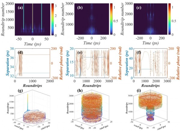 這種光譜振蕩行為證明了類束縛態調Q鎖模脈沖孤子間相位差的不穩定性,基于此實驗結果提出了 “類束縛態”(bound-state-like)的概念,它被定義為包含兩個或更多脈沖的孤子序列,子脈沖間具有穩定的間距但其相位差存在混沌變化。研究人員通過數值模擬復現了實驗狀態,并對束縛態脈沖及類束縛態脈沖孤子間距及相位變化進行了深入對比分析。圖3展示了束縛態孤子以及兩種不同演化過程的類束縛態調Q鎖模脈沖對應的孤子間距和相位差的數值模擬結果。在圖3(d)中,脈沖穩定后,束縛態孤子脈沖之間的間距和相位差都保持不變,與傳統定義完全一致。而在圖3(e)和圖3(f)所示的類束縛態脈沖中,即使子脈沖之間的距離穩定,相位差仍會出現混沌變化。這些數值模擬結果進一步證實了作者對 “類束縛態 ”概念定義的科學性。