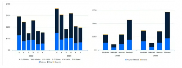 聚合物3D打印對(duì)民用無(wú)人機(jī)產(chǎn)生了重大影響,占聚合物收入的56.5%。盡管技術(shù)陶瓷AM仍是小眾市場(chǎng),但由于該材料適用于極端環(huán)境,它在民用空間應(yīng)用方面取得了顯著增長(zhǎng)。