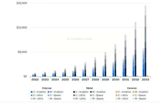 預(yù)計(jì)到2033年,航空航天AM的銷售額將超過(guò)200億美元,其中硬件收入預(yù)計(jì)將達(dá)到39億美元。