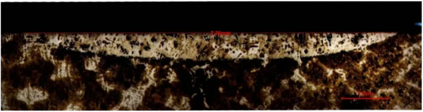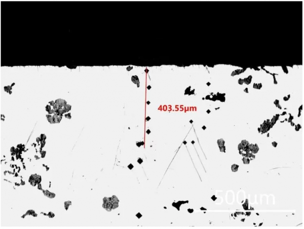 該零件材料為球墨鑄鐵,需要對表面進行淬火,嚴格控制淬火寬度6mm-8mm,表面硬度大于30HRC,淬火層深度0.3mm-0.5mm。采用機器人搭配10mm*2mm整形光斑淬火頭以及銳科CL系列6000W(600μm)光纖激光器進行淬火測試,淬火速度為4mm/s,激光功率1200W。圖4為零件外形圖和淬火后的表面狀態,圖5為淬火帶寬度和硬化層深度。可以看出零件表面淬火均勻,無熔凝現象,淬火帶寬度約7.8mm,淬火層深度約0.4mm,滿足技術要求。