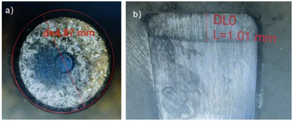 圖6為45號鋼零件軸的外形圖,該零件直徑為5mm,長度20mm,需要對軸端面進行淬火,表面硬度大于45HRC,淬火深度不小于1mm。由于零件尺寸太小,傳統的表面淬火無法精準的控制加熱區域,很容易造成零件整體硬度偏高,而激光淬火因能精準控制加熱區域和加熱時間,能很好的控制淬火質量。采用機器人搭配準直聚焦淬火頭以及銳科CL系列6000W(600μm)光纖激光器進行淬火測試,采用定點加熱的方式完成淬火,加熱時間僅為3s,激光功率800W。圖7為零件淬火后表面和淬火層形貌和深度測試結果,零件淬火表面硬度為55HRC,淬火層深度為1mm,滿足技術要求。