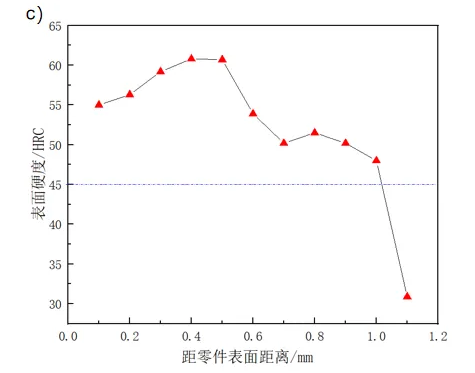 a)淬火后表面狀態 b)金相法檢測淬火層深度 c)硬度法檢測淬火層深度