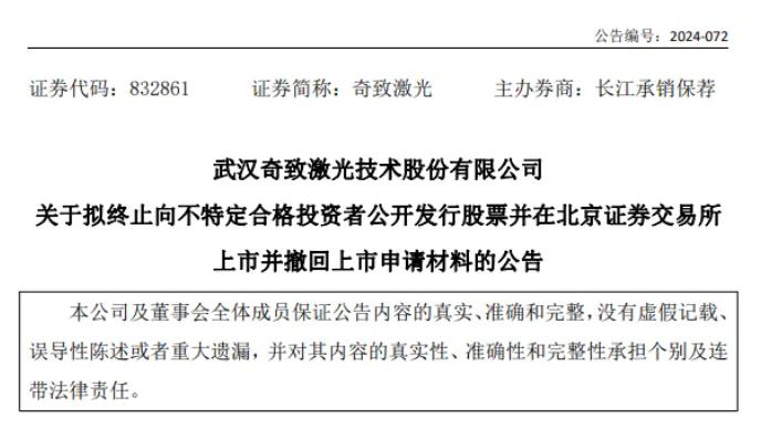 近日,奇致激光發(fā)布公告宣稱,公司于 2024 年 12 月 23 日審議通過了《關(guān)于終止向不特定合格投資者公開發(fā)行股票并在北京證券交易所上市的議案》和《關(guān)于撤回向不特定合格投資者公開發(fā)行股票并在北京證券交易所上市申請材料的議案》。