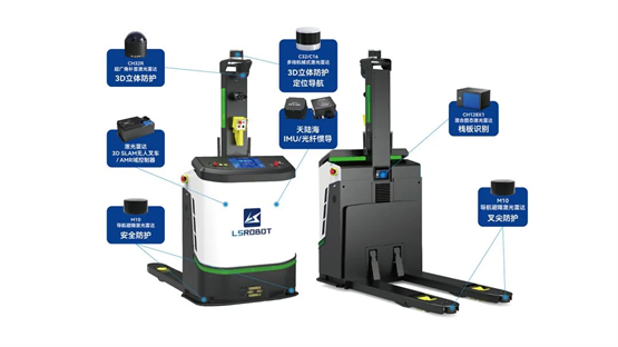 而在工業(yè)物流領(lǐng)域,鐳神智能的3D SLAM無(wú)人叉車同樣憑借7顆不同類型激光雷達(dá)協(xié)同作戰(zhàn),打造了360°全方位立體安全防護(hù),成為了保障作業(yè)安全的典范。