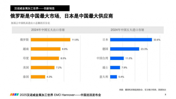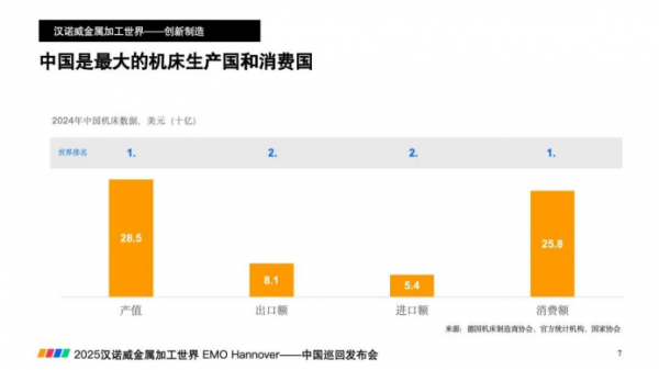 2024年,中國機床總產值約為290億美元,位居世界前列,是全球第一大生產國。機床出口約占總產量的29%,主要客戶群體分布于電氣、機械工程和汽車行業。對于金屬加工企業而言,機械工程和汽車制造行業是其核心需求方,因此也是EMO的主要專業觀眾。