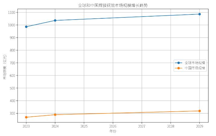 以下為全球和中國(guó)焊接鋼管市場(chǎng)規(guī)模增長(zhǎng)趨勢(shì)圖,直觀展示了市場(chǎng)規(guī)模的變化: