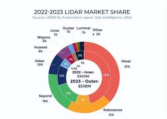 從2023年的廠商市場份額來看,禾賽科技(37%)、速騰聚創(21%)、圖達通(19%)占據了全球前三,華為(6%)、大疆覽沃(1%)分別排名第五、第七。