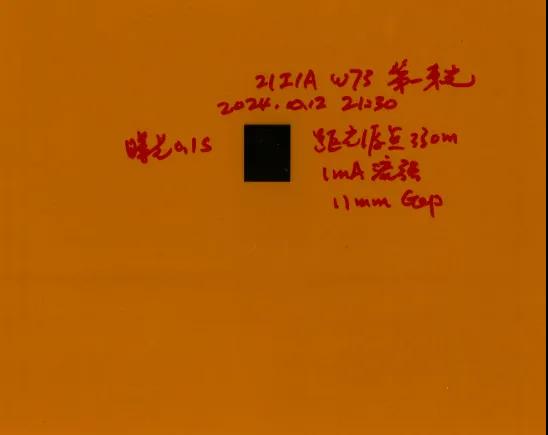 看到第一束光打出的黑斑,現場躁動起來,有人遞給董宇輝一支紅色馬克筆,讓他在膠片上寫點東西。他拔下筆帽,在黑色光斑周圍寫下:“21I1A,W73,第一束光;2024.10.12,21:30;曝光0.1s(秒);距光源點330m(米)……”