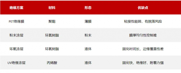 目前,主流的電芯絕緣方案大致分為四種,分別是PET絕緣膜、粉末涂層、環氧涂層和UV絕緣涂層。PET膜是薄膜形態,與電池殼體之間的粘接性能較弱,在復雜使用環境下容易脫落,電池安全性降低。環氧涂層工藝雖然在一定程度上解決了PET膜附著力不足的問題,但其固化時間長,影響生產效率。粉末噴涂工藝在某些場景下也有應用,但其均勻性難以控制,且存在較高的安全隱患。此外,粉末噴涂對環境也有一定影響,不符合現代制造業的環保要求。因此,UV涂裝工藝憑借快速固化、強附著力、高絕緣性等優勢,正逐漸成為電池絕緣涂覆的新趨勢。