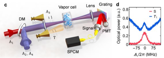 圖1. (a) 太赫茲—近紅外光子相干上轉換原理圖;(b) 非簡并六波混頻87Rb 原子系統能級圖;(c) 實驗裝置示意圖;(d) 六波混頻產生信號 (紅色) 和泵浦場透射信號 (藍色) 。
