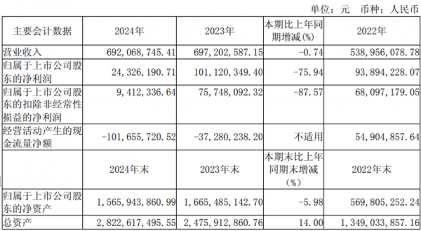 4月30日,武漢逸飛激光股份有限公司(以下簡稱“逸飛激光”)發布的2024年度報告顯示,公司實現營業收入6.92億元,同比微降0.74%;歸屬于上市公司股東的凈利潤2432.62萬元,同比大幅下降75.94%。
