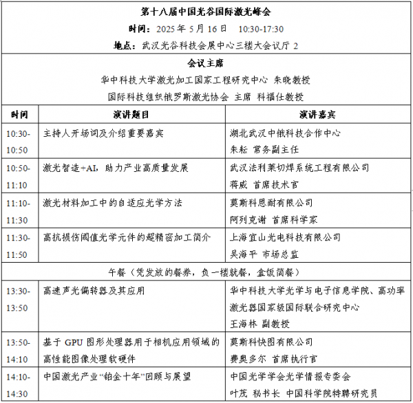 在第二十屆“中國光谷”國際光電子博覽會(OVC EXPO 2025)框架下,第十八屆中國光谷國際激光峰會將于2025年5月16日,10:30-17:30,在武漢光谷科技會展中心三樓大會議廳2舉辦。