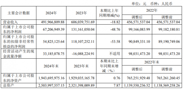 華曙高科2024年度實現營業收入4.92億元,同比下降18.82%;歸屬于上市公司股東的凈利潤6720.69萬元,同比下降48.76%;歸屬于上市公司股東的扣除非經常性損益的凈利潤5482.51萬元,同比下降53.58%。