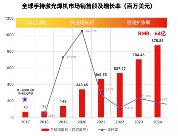2017年深圳銘鐳激光推出全球首臺手持激光焊機,這也是由中國人最先首創推出的第一款通用金屬加工設備,具有里程碑意義。后續受光纖激光器大幅跳水,價格狂降至0.65-0.7萬元/千瓦,直接推動全球手持激光焊市場7年暴增12倍。2024年全球手持激光焊市場銷售額達64億人民幣,同年中國以71%全球市場份額碾壓式領跑手持激光焊機市場,份額超北美5倍、超歐洲9倍。這不僅反應出中國在裝備制造領域的全產業鏈統治力,更加說明中國將在未來很長一段時間主導全球手持激光焊市場、技術、產品的發展。