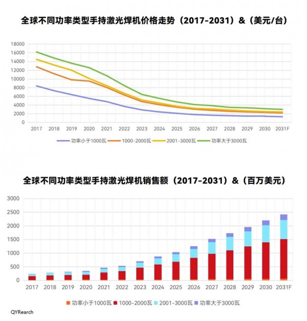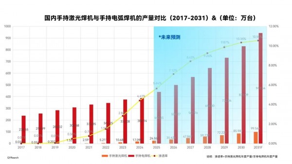 手持激光焊技術憑借其高效、精密、靈活等優勢,正在多個行業領域實現規模化應用,并呈現小型化、集成化、智能化趨勢。據報告顯示,到2031年,全球手持激光市場規模將達到176億,年銷售臺數106.8萬臺。