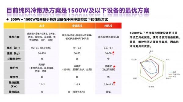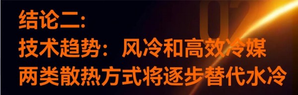 隨著純風冷散熱技術的提升與突破,純風冷適配的功率段會提升至2kW。因此可以判斷未來趨勢:2000W以內,風冷將以“主機槍頭輕、更便攜、成本低、能耗低、冬天使用穩定、易維護”等特點逐漸替代水冷;2000W以上,與水冷對比,高效冷媒效率更高,能耗更低,成本比水冷略低,冬天易維護,高效冷媒將會取代水冷,成為2000W以上中高功率段技術和產品主流。