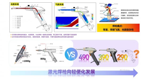 早期手持激光焊槍結構復雜、光路易損,為此焊槍一般都比較笨重,焊工操作不便,適用范圍不及氬弧焊,嚴重限制了手持激光焊的普及,而如今激光焊槍也逐步向輕便化方向發展。