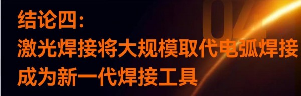 激光焊槍相對于電弧處于游離氣體放電現象,依賴電極與焊件空間距離控制、電弧質量輕、易飄忽變形,焊接工藝依賴于焊工對電弧能量的控制,依賴于焊工對電極與焊件距離的控制,同時由于電弧能量密度低,熔池易凝固,還需要額外配合焊工復雜的操作手法,對焊工焊接工藝和熟練程度要求很高;激光直接由光纖激光器穩定產生和輸出、準直高亮度,能量密度高,能量傳遞過程穩定。結合振鏡,可以實現動態的出光擺動,并控制光斑大小、形狀、均勻性等,替代焊工復雜手法控制,適應不同的加工或顯示需求。由此從技術原理上可得出結論:激光焊接將大范圍替代電弧焊接,成為焊接領域新一代的加工工具。