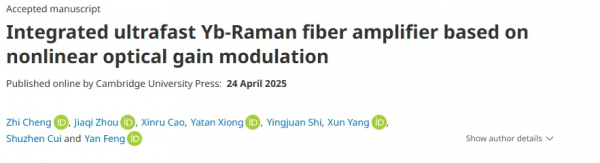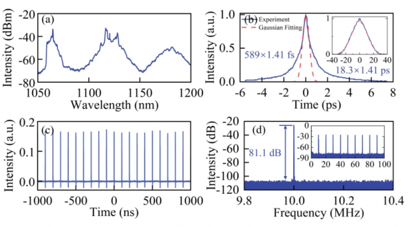 近期,中國科學院上海光學精密機械研究所空天激光技術與系統部周佳琦研究員團隊,在超快光纖激光稀土拉曼混合放大研究方面取得進展。 相關成果以“Integrated ultrafast Yb-Raman fiber amplifier based on nonlinear optical gain modulation”為題,發表在High Power Laser Science and Engineering上。 在傳統的非線性光學增益調制系統中,泵浦脈沖能量放大單元和非線性光學頻率轉換單元是分開的,一方面需要高功率波分復用器耦合高能泵浦脈沖和單頻連續激光種子,另一方面高功率工作下有源光纖和無源光纖的熔接也會對系統長期穩定性構成風險。 圖1 實驗裝置示意圖 針對這些問題,研究團隊開發了一種新型的超快光纖激光稀土拉曼混合放大器,利用摻鐿光纖同時提供稀土增益和拉曼增益,可以產生單脈沖能量更高的拉曼脈沖(圖1)。在實驗中,一階拉曼脈沖的單脈沖能量可被放大至~1 μJ,脈寬可壓縮至589 fs,最大拉曼轉換效率可達69.9 %(圖2),并且通過數值模擬探究了產生10 μJ量級拉曼脈沖的可能。該研究提供了一種產生微焦量級拉曼脈沖的方法,在非線性光學成像和微機械加工等領域具有潛在的應用價值。 圖2拉曼脈沖輸出特性 (a)光譜;(b)自相關曲線;(c)脈沖序列;(d)RF譜