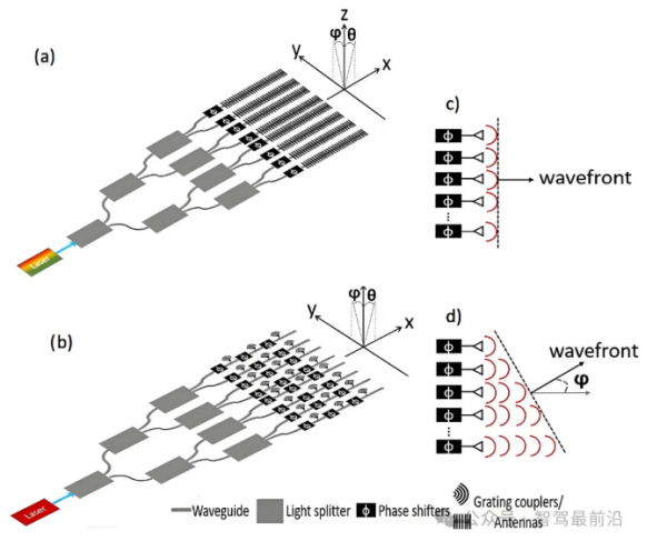 • 圖(a):左側(cè)激光源(Laser)發(fā)出光,經(jīng)波導(dǎo)傳輸,由分光器將光分成多路,每路光經(jīng)過移相器后,由光柵耦合器 / 天線發(fā)射出去。圖中展示了光在光學(xué)相控陣中的傳輸路徑,通過坐標(biāo)軸(x、y、z)及角度(φ、θ)表示光的出射方向。