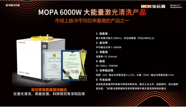 寶辰鑫MOPA 6000W脈沖光纖激光器,是市場上脈沖平均功率最高的產品之一,具有兆瓦級峰值(可達2MW以上),300mJ高單脈沖能量,發散角<0.15mrad,脈寬60~200ns(FWHM),短期(1H)輸出功率穩定度±1.5%,長期(24H)輸出功率穩定度±3%,在加工精度、穩定性、控制等方面具備顯著優勢,可在工業大件、船舶鑄件、航天器表面涂層、飛機雷達罩表面除漆清洗等領域里實現典型應用。