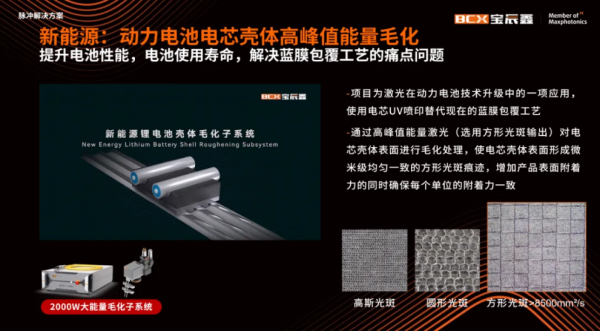 MOPA 1000W-2000W 脈沖光纖激光器,單機最大單脈沖能量 100mJ,輸出光斑能力可定制,在動力鋰電池電芯殼體表面毛化、藍膜鈍化等多個項目中建立了激光行業應用的典范,引領行業創新浪潮。