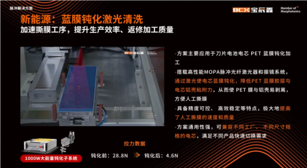 藍膜鈍化項目中,搭載高性能MOPA脈沖光纖激光器和振鏡系統的一體化脈沖方案,通過激光使電芯藍膜鈍化,降低PET 藍膜膠層與電芯鋁殼粘附力,從而使 PET 膜與鋁殼易剝離,鈍化前拉力28.8N,鈍化后僅為4.6N,方便人工撕膜。