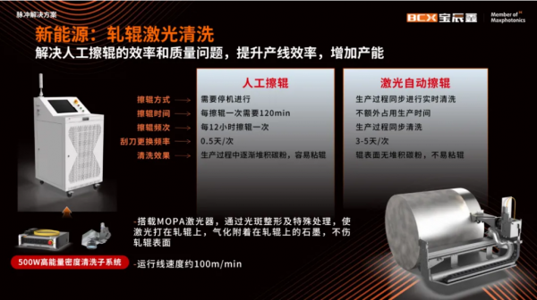 在軋輥清洗應用上,通過激光自動擦輥方案,解決人工擦輥的效率和質量問題,提升產線效率,增加產能。方案搭載500W MOPA激光器,通過光斑整形及特殊處理,使激光打在軋輥上,氣化附著在軋輥上的石墨,不傷軋輥表面。