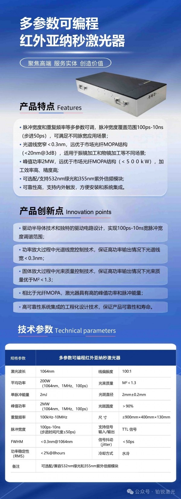 鉑銳激光面向玻璃和硬脆半導(dǎo)體高質(zhì)量加工市場,推出Evan系列多參數(shù)可編程紅外亞納秒激光器,與市場同類產(chǎn)品相比,脈寬調(diào)諧范圍寬(100ps-10ns)、光譜線寬窄(<0.3nm)、光束質(zhì)量高(M2<1.3)、峰值功率高(2MW)、集成度高,同時兼容532nm綠光和355nm紫外倍頻模塊,可實現(xiàn)更高的加工效率、精度和質(zhì)量。