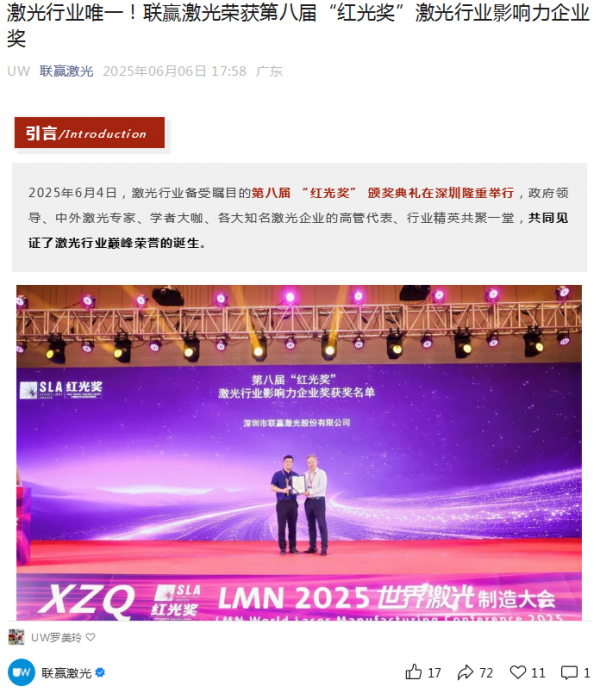 比如榮獲“激光行業影響力企業獎”的聯贏激光,以《激光行業唯一!聯贏激光榮獲第八屆“紅光獎”激光行業影響力企業獎》為題,在公眾號中重點宣傳了企業獲獎喜訊。文章回顧了聯贏激光20年來在激光行業的發展歷程,從初創時期的艱難探索,到如今成為行業領軍企業的輝煌成就。通過展示企業在技術研發、產品創新、市場拓展等方面的成果,向讀者展現了聯贏激光的品牌實力和行業影響力。