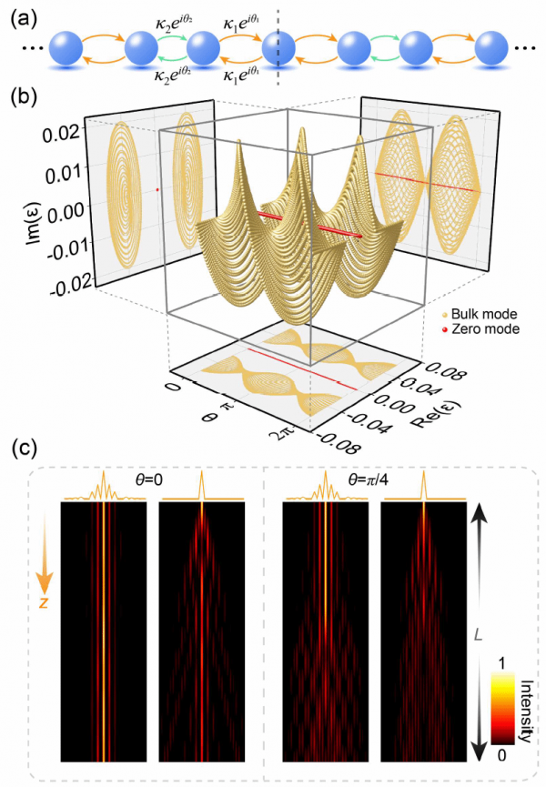 在本工作中,研究人員考慮了具有非厄米耦合相位的Su-Schrieffer-Heeger (SSH) 模型(如圖1(a)),通過引入輔助復耦合系數調節其耦合相位,可以實現耦合系數由保守(純實數)到混合(復數)再到耗散(純虛數)的連續轉變。研究發現,該模型的拓撲性質由胞內/胞間的耦合強度差決定,而耦合相位會改變體帶在復能譜空間中的分布。隨著耦合相位θ增大,體帶發生了扭曲,并出現了虛部分量,而拓撲態由于體系的對稱性約束始終是一個零模,如圖1(b)所示。所有耦合相位對應的拓撲態都具有相同的局域程度,然而它們的動力學演化行為卻非常不同。例如,對于保守拓撲(θ=0),不管是單根激發(偏離完美本征態較多,保真度約為0.6),還是接近完美的本征態(保真度約為0.98),都能支持拓撲態的激發和演化;而對于一般的混合拓撲情形(如θ=π/4),單根激發拓撲態將很容易彌散,而接近完美本征態的激發雖能演化更長的距離,最終還是出現了明顯彌散現象(圖1(c)),這意味著此時的拓撲態是很敏感的,極易受到擾動而偏離拓撲態。