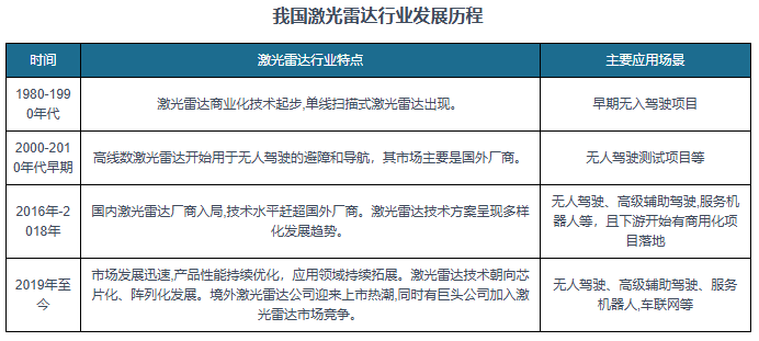 發(fā)展歷程來看,我國激光雷達(dá)行業(yè),在2000年以前,激光雷達(dá)的商業(yè)化技術(shù)以及智能網(wǎng)聯(lián)行業(yè)均處于起步階段,激光雷達(dá)在車載領(lǐng)域應(yīng)用有限。21世紀(jì)以來激光雷達(dá)的系統(tǒng)架構(gòu)得到拓展,從單線掃描逐漸發(fā)展到多線掃描,激光雷達(dá)對(duì)環(huán)境三維高精度重建的應(yīng)用優(yōu)勢(shì)被逐漸認(rèn)可,基于激光雷達(dá)的避障與導(dǎo)航技術(shù)在無人駕駛應(yīng)用中得到逐步發(fā)展。2016年后,在汽車產(chǎn)業(yè)“電氣化、共享化、網(wǎng)聯(lián)化、智能化”的“新四化”驅(qū)動(dòng)下,隨著無人駕駛行業(yè)高速發(fā)展,激光雷達(dá)行業(yè)也隨之進(jìn)入迅速發(fā)展期。