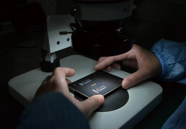 工作人員在蘇州光電技術研究院的封裝測試公共服務平臺車間內檢測一塊激光雷達芯片(圖:新華社)