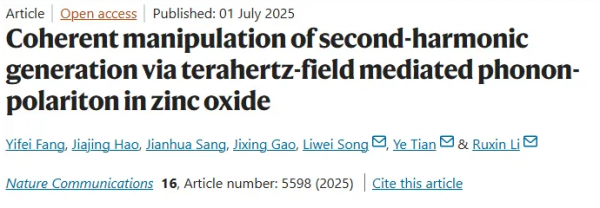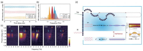 該成果以Coherent Manipulation of Second-Harmonic Generation via Terahertz-Field Mediated Phonon-Polariton in Zinc Oxide為題在線發(fā)表于Nature Communications。 高速信號(hào)調(diào)制技術(shù)是光通信、數(shù)據(jù)中心、量子計(jì)算等前沿領(lǐng)域的核心支撐。近年來(lái),硅基和鈮酸鋰基兩大技術(shù)路線在材料集成、工藝突破與應(yīng)用場(chǎng)景擴(kuò)展上均取得顯著進(jìn)展。傳統(tǒng)的硅基電光調(diào)制技術(shù)基于自由載流子等離子色散(FCPD)效應(yīng)或直流Kerr效應(yīng),通過(guò)施加電壓調(diào)制光的相位或強(qiáng)度。這種方式受限于電子驅(qū)動(dòng)頻率、RC延遲、電極設(shè)計(jì)等因素,調(diào)制帶寬難以突破百GHz量級(jí)。鈮酸鋰基電光調(diào)制技術(shù)基于線性電光效應(yīng)(Pockels效應(yīng)),通過(guò)外加電場(chǎng)改變晶體折射率,進(jìn)而調(diào)控馬赫-曾德爾(MZ)干涉儀兩臂間的相位差,實(shí)現(xiàn)高速、高線性度的光信號(hào)調(diào)制。目前已實(shí)現(xiàn)數(shù)百GHz的信號(hào)調(diào)制,但受限于電極微波與光波速度失配等問(wèn)題,達(dá)到THz頻率的高速調(diào)制仍面臨挑戰(zhàn)。 近年來(lái),團(tuán)隊(duì)在科技部重點(diǎn)研發(fā)專項(xiàng)“超快強(qiáng)激光泵浦強(qiáng)太赫茲源驅(qū)動(dòng)材料與器件非平衡態(tài)研究”支持下,在“羲和”等強(qiáng)激光大科學(xué)裝置發(fā)展了強(qiáng)場(chǎng)太赫茲調(diào)控平臺(tái)與技術(shù):實(shí)現(xiàn)了基于鈮酸鋰晶體的最強(qiáng)THz脈沖源能量紀(jì)錄13.9 mJ [Advanced Materials, 35(23): 2208947 (2023)];發(fā)展了國(guó)際首個(gè)超越MeV的太赫茲波導(dǎo)電子槍,在指尖尺寸(長(zhǎng)度5mm)距離實(shí)現(xiàn)最高1.1 MeV的電子能量增益 [Nature Photonics 17, 957–963 (2023)]。團(tuán)隊(duì)針對(duì)調(diào)控機(jī)理及器件研發(fā)等目標(biāo)展開攻關(guān),系統(tǒng)研究了寬禁帶半導(dǎo)體ZnO中聲子極化激元(PhP)的產(chǎn)生機(jī)制及其調(diào)制原理。 PhP是一類由紅外活性光學(xué)聲子與電磁波強(qiáng)耦合而形成的準(zhǔn)粒子,具有方向性強(qiáng)、電場(chǎng)限域能力高等特性,廣泛存在于極性晶體中,特別活躍于THz頻段。在自主搭建的超快THz泵浦-探測(cè)系統(tǒng)上,通過(guò)調(diào)控THz場(chǎng)強(qiáng)、偏振、紅外光波長(zhǎng)等,成功激發(fā)出3~4 THz范圍內(nèi)的PhP。該P(yáng)hP以THz頻率調(diào)控ZnO晶體內(nèi)極化反轉(zhuǎn),進(jìn)而激發(fā)光波的SHG過(guò)程,且產(chǎn)生的光學(xué)SHG相位以THz頻率變化。這一相位高速調(diào)制的光信號(hào)與晶體內(nèi)本征SHG干涉,可實(shí)現(xiàn)光信號(hào)強(qiáng)度的THz頻率調(diào)制。這種通過(guò)調(diào)控相位實(shí)現(xiàn)信號(hào)強(qiáng)度高速調(diào)制的機(jī)制,可類比于鈮酸鋰基光信號(hào)調(diào)制原理,而調(diào)制頻率提高了一個(gè)量級(jí)。得益于ZnO晶體中PhP的低損耗、高反射特性,PhP在1mm晶體內(nèi)完成九次反射,對(duì)SHG信號(hào)實(shí)現(xiàn)了持續(xù)約90ps,消光比約18 dB,頻率3~4THz的高速調(diào)制。 這種基于THz-PhP 驅(qū)動(dòng)的光學(xué)SHG產(chǎn)生與調(diào)制過(guò)程,構(gòu)建了一種全新的時(shí)頻聯(lián)合控制平臺(tái)。相比傳統(tǒng)非線性調(diào)制器,PhP 系統(tǒng)具備兩大關(guān)鍵優(yōu)勢(shì):一是工作頻率覆蓋 THz 至中紅外的寬廣頻段,滿足高帶寬應(yīng)用需求;二是其周期性傳播結(jié)構(gòu)天然適配相干控制,能夠?qū)?THz 振蕩特征嵌入通信波段光學(xué)響應(yīng)中,適用于構(gòu)建頻率轉(zhuǎn)換器件。研究構(gòu)建了“光聲準(zhǔn)粒子機(jī)制——光脈沖調(diào)制器”,對(duì)THz超高重頻激光的研發(fā)具有重要意義,并有望作為THz頻率調(diào)制器等核心部件應(yīng)用于超高速光信息通訊領(lǐng)域。 圖 (a)-(c)展示利用紅外探測(cè)光研究THz-PhP激發(fā)和傳輸動(dòng)力學(xué)。圖(d)展示THz輔助聲子激發(fā)及THz-PhP演化實(shí)驗(yàn)結(jié)果與相位匹配機(jī)理