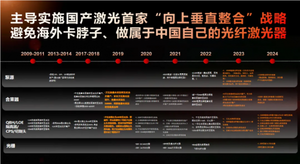 作為國內(nèi)首批成立的光纖激光器企業(yè),創(chuàng)鑫激光率先實(shí)現(xiàn)了光纖激光器及核心光學(xué)器件兩類核心技術(shù)的垂直整合,自主開發(fā)數(shù)十種光纖激光器高功率核心器件如泵源、QBH、準(zhǔn)直器、合束器、隔離器、聲光調(diào)制器等,全面提升系統(tǒng)可靠性,完成國產(chǎn)大功率光纖的量產(chǎn)化開發(fā)。后續(xù)更把激光器件垂直整合延伸到了激光核心材料領(lǐng)域,大力推動(dòng)了激光國產(chǎn)化的發(fā)展,是中國激光產(chǎn)業(yè)發(fā)展的見證者、參與者和推動(dòng)者。