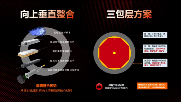 此外,創(chuàng)鑫激光創(chuàng)新式開發(fā)冷卻散熱設(shè)計(jì),采用浸泡式全接觸冷卻技術(shù),顯著提升光纖器件的可承受功率上限,解決了高功率激光器散熱難題;更獨(dú)創(chuàng)三包層光纖設(shè)計(jì),通過在傳統(tǒng)雙包層光纖結(jié)構(gòu)上增加第三層特殊包層,優(yōu)化激光器的功率承載能力和光束質(zhì)量,保證高功率出光的可靠性。系列技術(shù)手段有效提升了產(chǎn)品的性能和市場競爭力,迅速獲得了市場的廣泛認(rèn)可,大力推動(dòng)了國產(chǎn)激光器的商業(yè)化成熟應(yīng)用。
