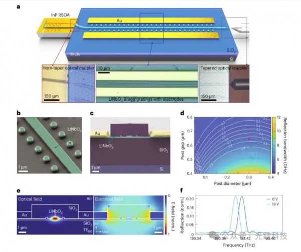 a, 混合集成 E-DBR 激光器的示意圖。TFLN:薄膜鈮酸鋰。插圖為:InP RSOA 與 PIC 之間的對接耦合界面的詳細顯微照片(左);布拉格光柵和調諧電極(中);用于輸出耦合的雙層錐形結構和透鏡光纖(右)。
