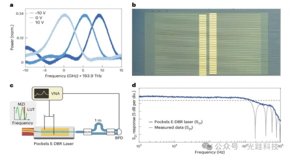 c, 表征泡克爾斯 E-DBR 激光器電光調諧帶寬的測量裝置圖。S?? 調諧響應通過矢量網絡分析儀(VNA)進行表征:將激光輸出饋入集成馬赫-曾德爾干涉儀(iMZI),并在快速光電二極管上檢測輸出光強。調整調諧范圍和延遲線長度,以利用 MZI 傳遞函數的線性部分(如插圖所示),將頻率調制轉換為光電二極管上的幅度調制。LUT:被測激光器;BPD:平衡光電探測器。