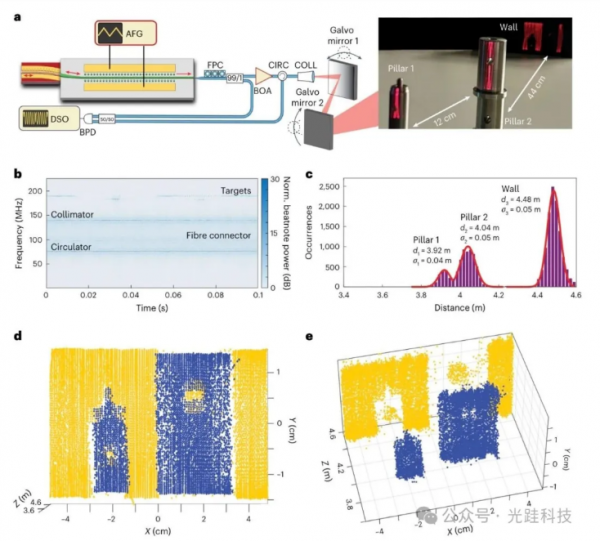 a, 基于FMCW激光雷達的相干光學測距實驗裝置示意圖,并附有目標場景的照片:兩個Thorlabs立柱基座(直徑分別為1毫米和2.5毫米)以及后面的一堵平墻。DSO:數字采樣示波器;FPC:光纖偏振控制器;BOA:后置光放大器;CIRC:環形器;COLL:準直器。